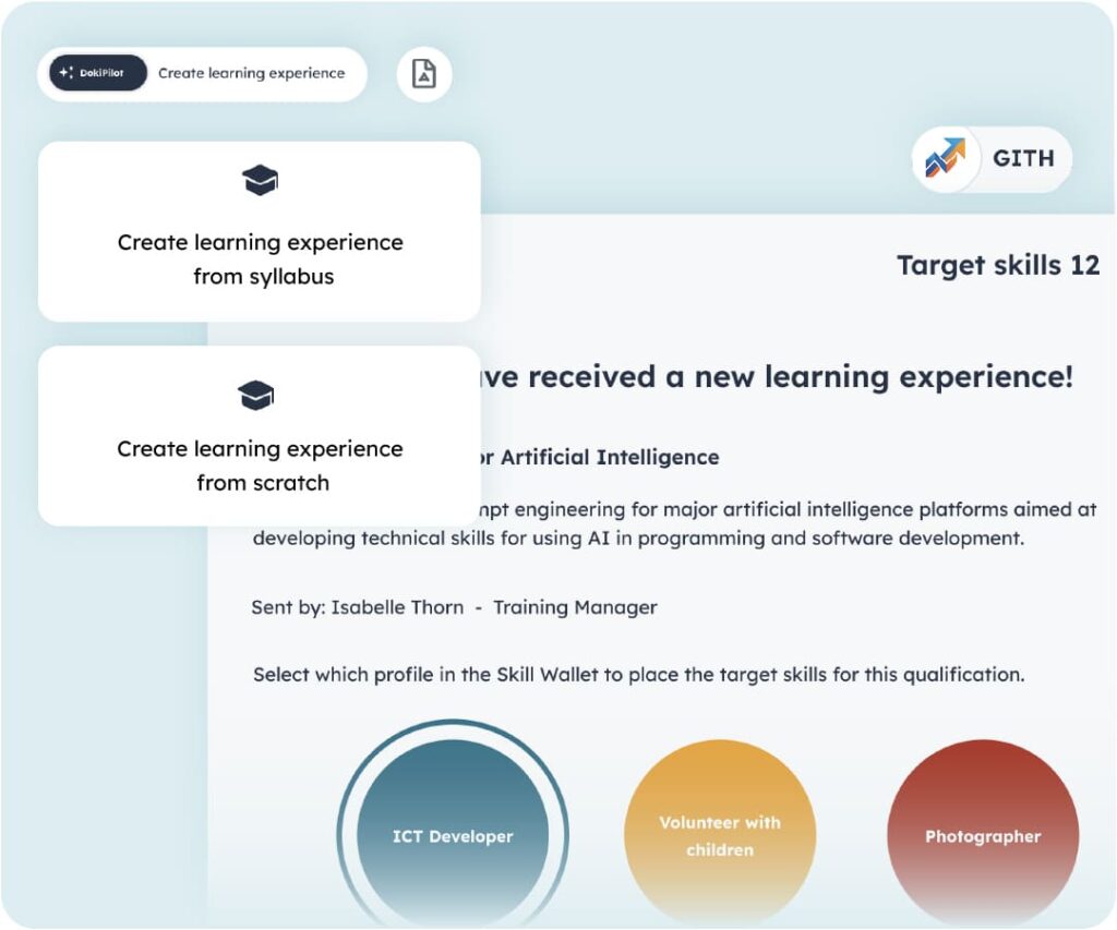 - Upload the syllabus or describe the learning experience: Dokipilot automatically extracts the relevant skills, also suggesting ESCO matches when available.