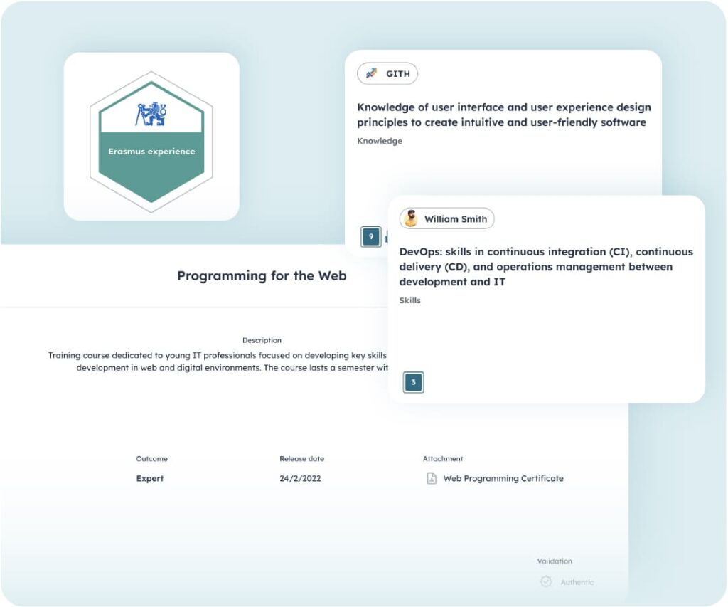 - For each skill, you can create an official evidence — certificate, credential, or competency assessment — which can also be issued in Open Badge format according to the most widely adopted standards.