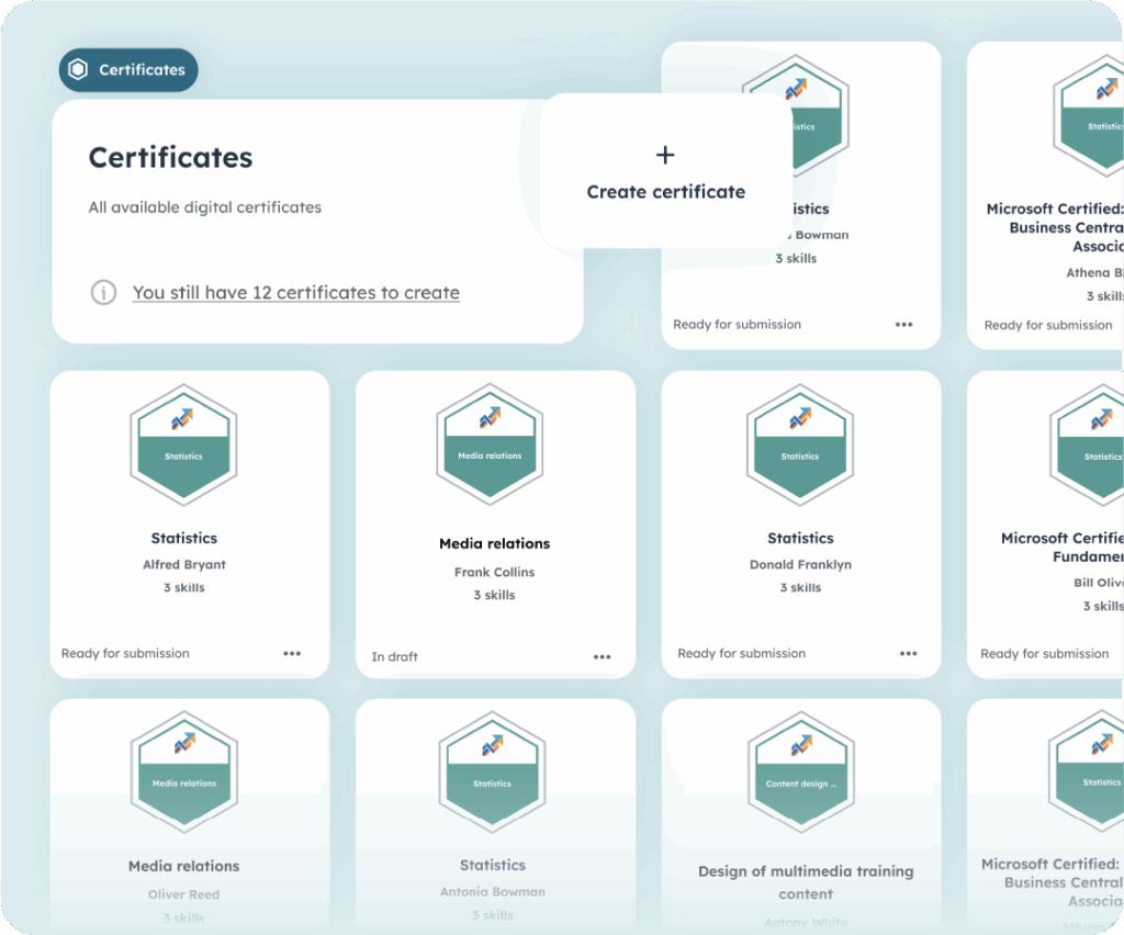 Assessments are automatically turned into digital micro-credentials — certificates, credentials, or Open Badges — that document learning in a verifiable way.